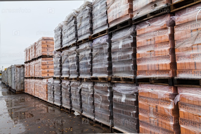 Кирпич, склад строительных материалов, палета кирпичей в пленке на поддоне