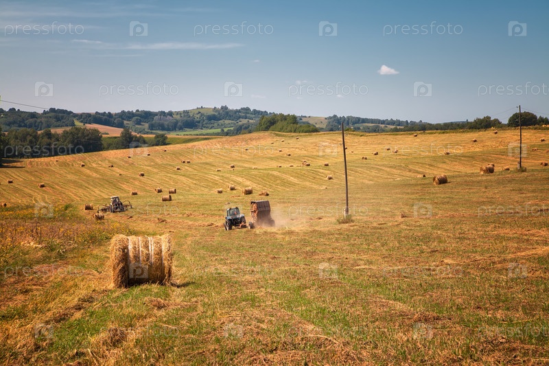 Рулоны свежего сухого сена в полях. трактор собирает скошенную траву. поля желтой скошенной травы на фоне голубого неба
