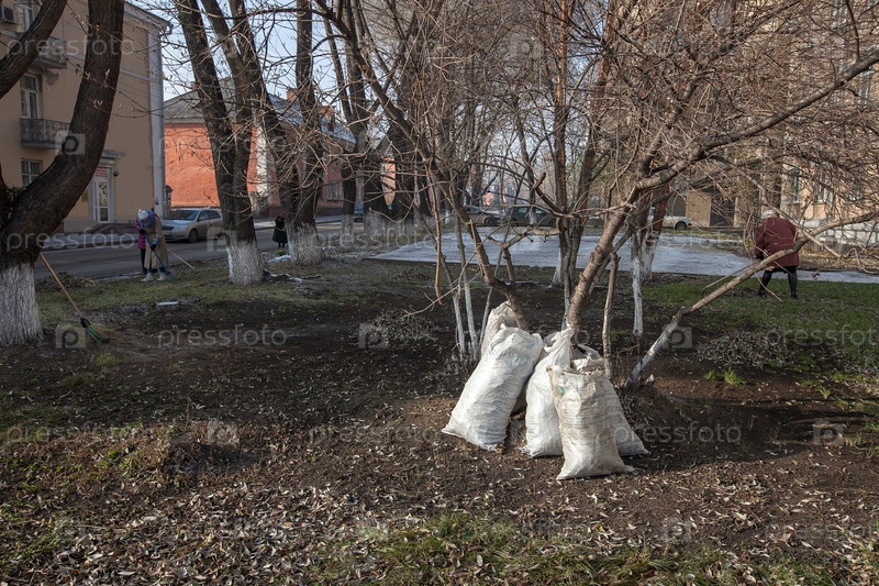 Уборка территории в межсезонье. мешки с мусором стоят у дерева