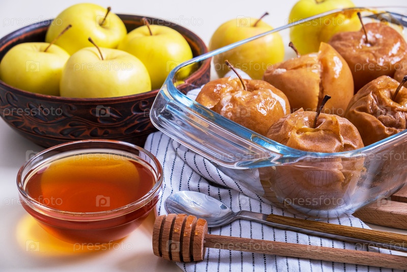 Запеченные карамелизированные яблоки с медом в стеклянной огнеупорной форме для выпечки