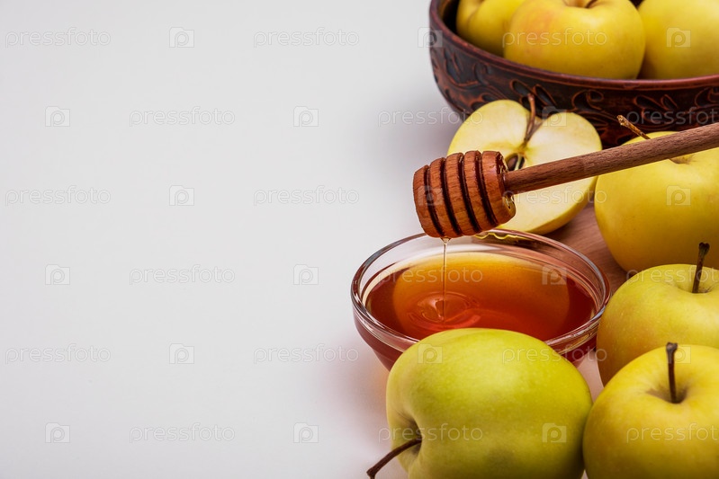 Свежие спелые целые и нарезанные желтые яблоки с медом