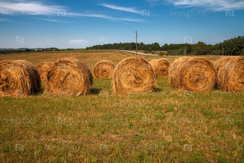 Алтай. Рулоны свежего сена в рулонах на полях на фоне голубого неба