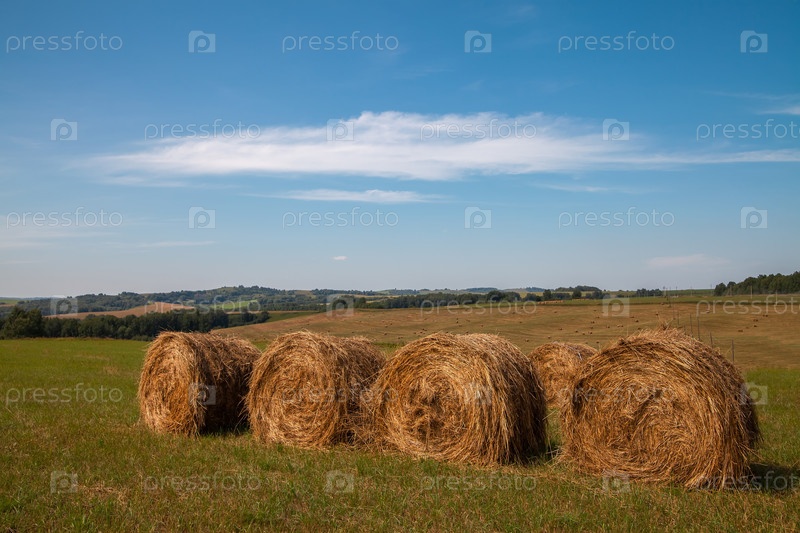 Рулоны свежего сена в рулонах на полях на фоне голубого неба