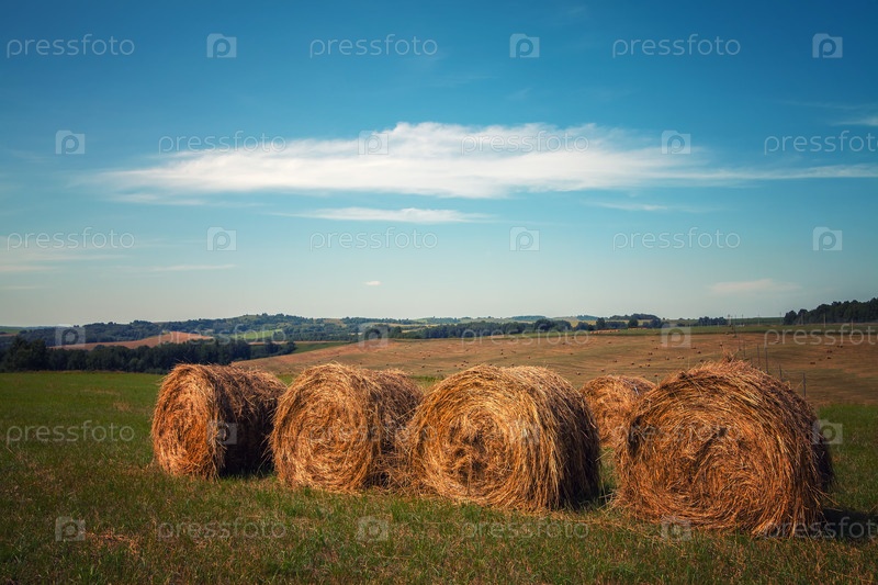 Рулоны свежего сена крупным планом на фоне голубого неба