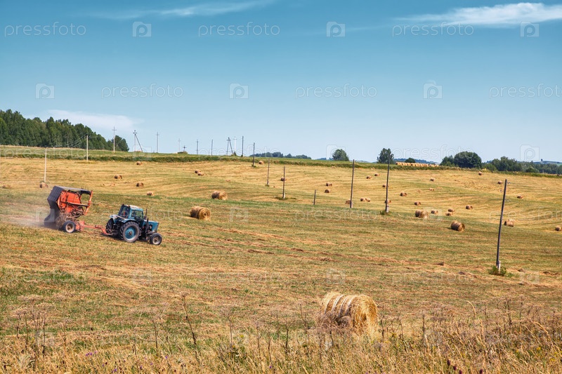 Алтайский край. Уборка сена. рулоны свежего сухого сена в полях. трактор собирает скошенную траву.