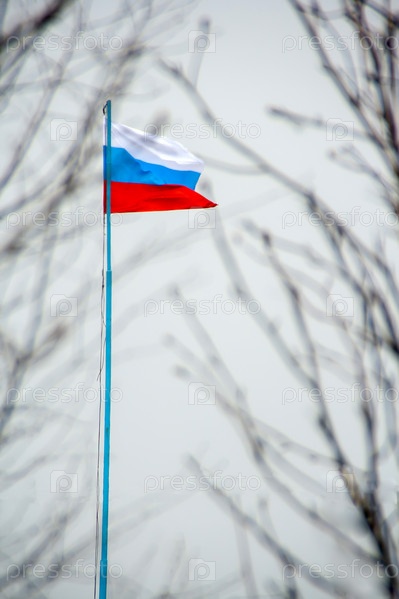 Российский флаг на флагштоке развевается на ветру среди ветвей деревьев