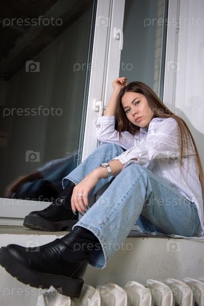 Девушка сидит на подоконнике темным вечером и не смотрит в темное окно