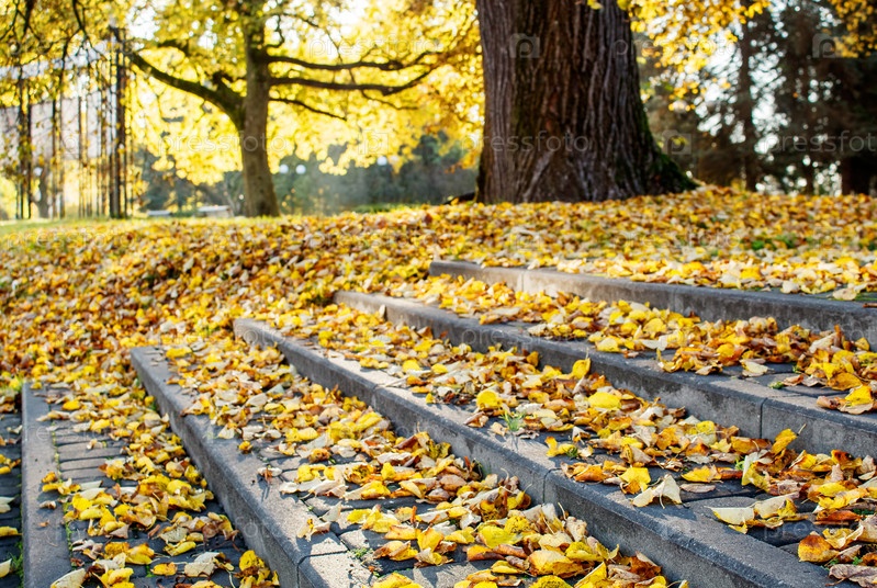 Лестница, покрытая желтыми листьями, в городском парке в солнечный осенний день