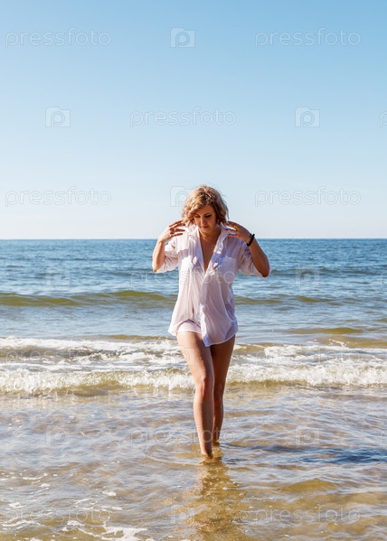 Молодая блондинка в мокрой белой рубашке выходит из воды у берега моря