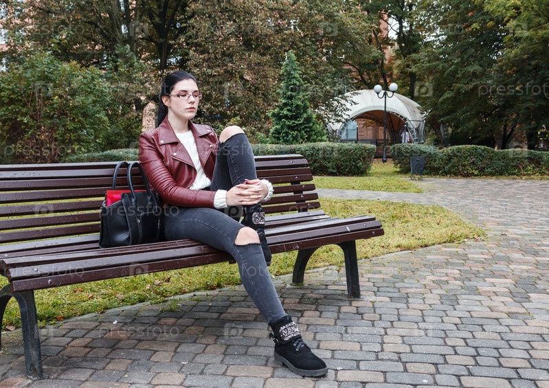 Молодая девушка в коричневой куртке и черных джинсах сидит осенью на скамейке в парке