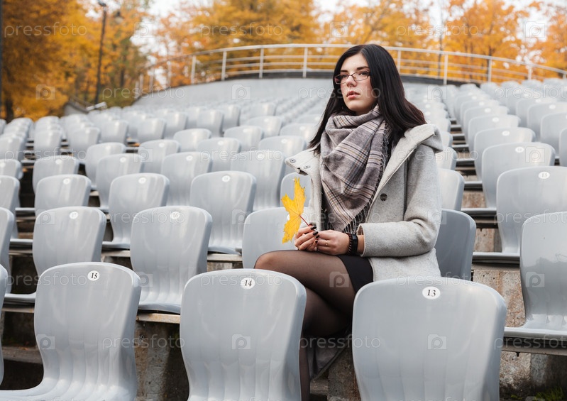 Маленькая девочка в сером пальто сидит на месте пустого стадиона