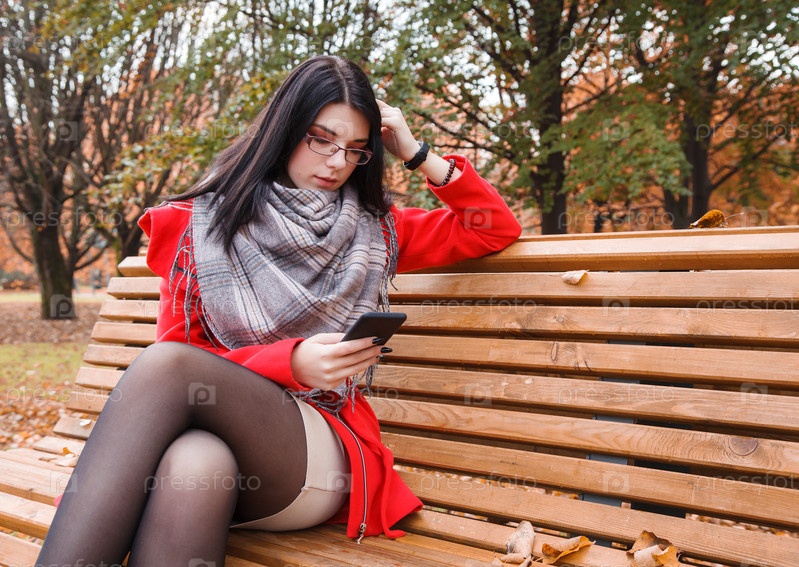 Молодая девушка смотрит на дисплей смартфона, сидя на скамейке в парке