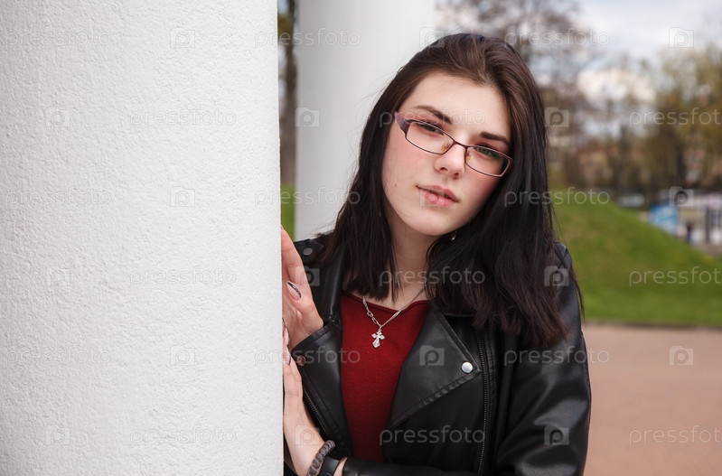 Молодая брюнетка красивая в черной кожаной куртке девушка выглядывает из-за столба в городском парке. открытый солнечный весенний день