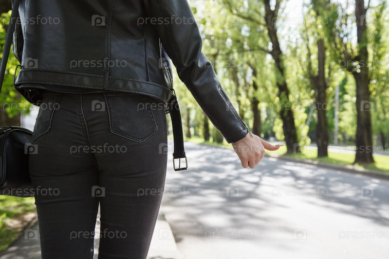 Девушка в черной куртке и джинсах останавливает машину в солнечный день. вид сзади