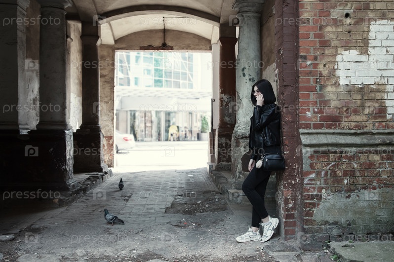 Грустная молодая девушка в черной куртке и джинсах стоит в старой арке на городской улице в летний день