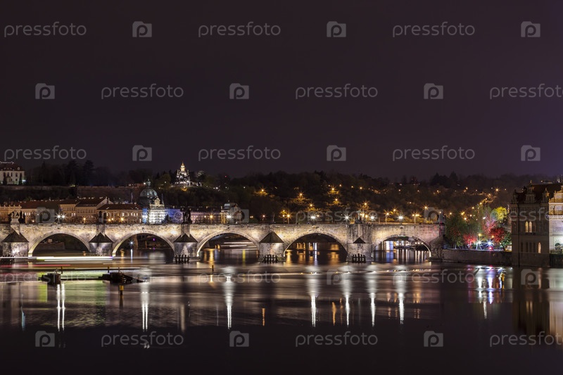 Карлов мост в Праге вечером с разноцветными огнями фонарей