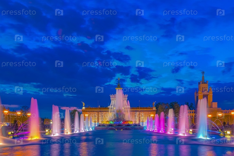 Яркий фонтан с подсветкой на ВДНХ в Москве вечером
