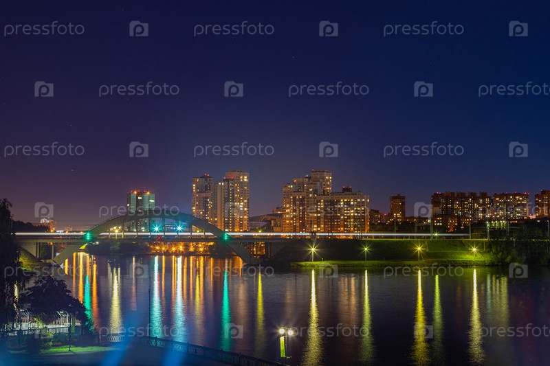 Ночной город в ярких огнях. Железнодорожный мост через реку