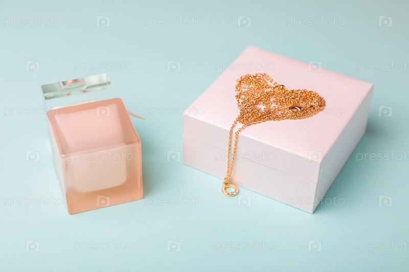 День Святого Валентина. Духи и коробка с цепочкой на синем фоне