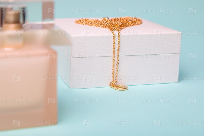 День Святого Валентина. Духи и коробка с цепочкой на синем фоне