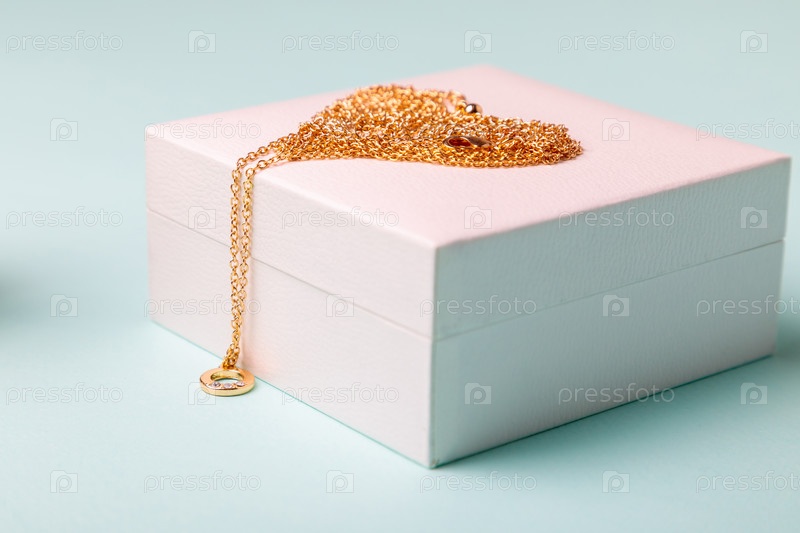 День Святого Валентина. Духи и коробка с цепочкой на синем фоне