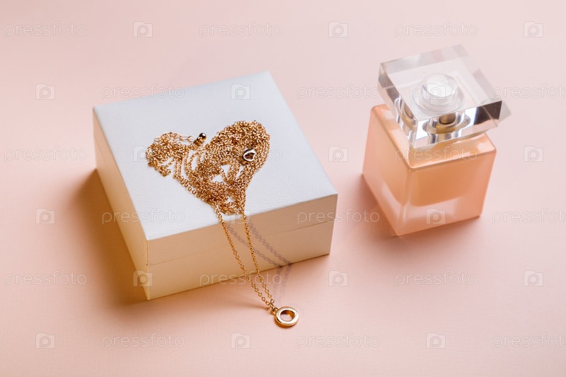 День Святого Валентина. Духи и коробка с цепочкой на розовом фоне