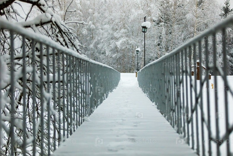 Мост с перилами в заснеженном зимнем парке