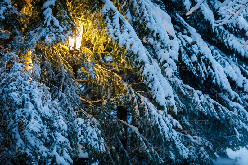 В парке между заснеженными елками светит желтый фонарь