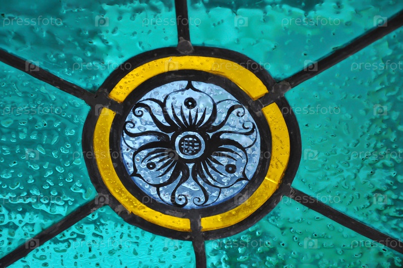 Цветное стекло. Витраж. Окно из кусочков стекла. Винтажное искусство. Россия