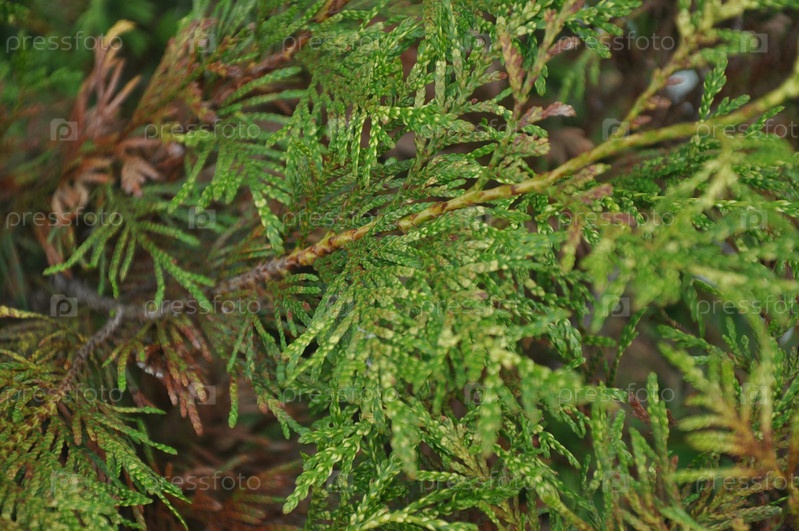 Хвойные ветки крупным планом. Зеленые иглы на зеленом фоне