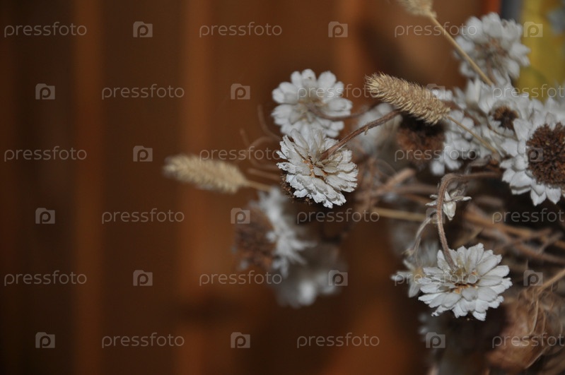 Белые сухоцветы на фоне деревянной стены. Сухие цветы и травы