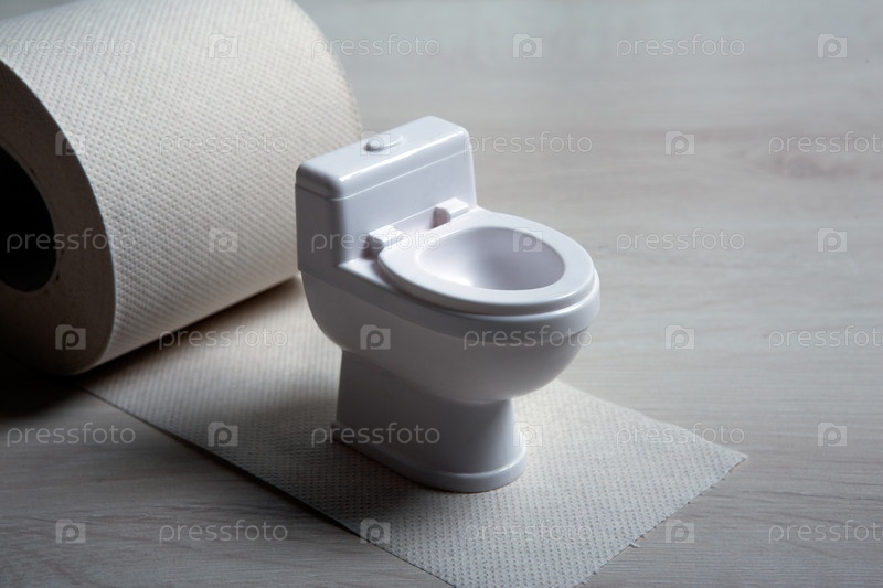 Миниатюрный унитаз с рулоном туалетной бумаги на столе
