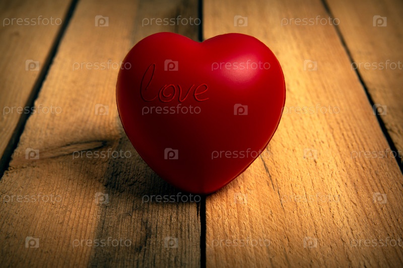 Большое красное сердце с надписью love на деревянном фоне