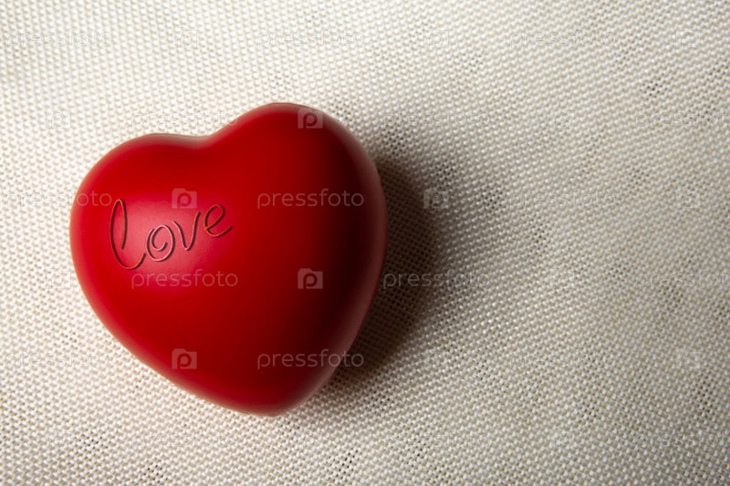 Большое красное сердце с надписью love на текстильном фоне