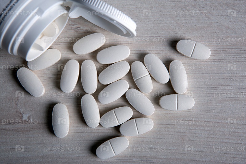 Белые таблетки с банкой на деревянном столе