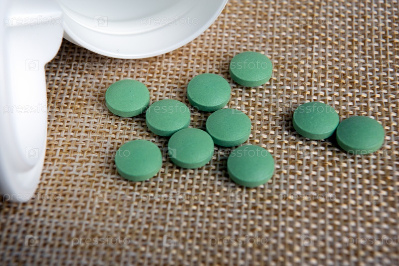 Круглые зеленые таблетки с баночкой на салфетке
