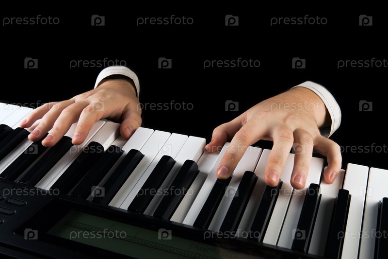 Руки пианиста в черном на клавишах пианино