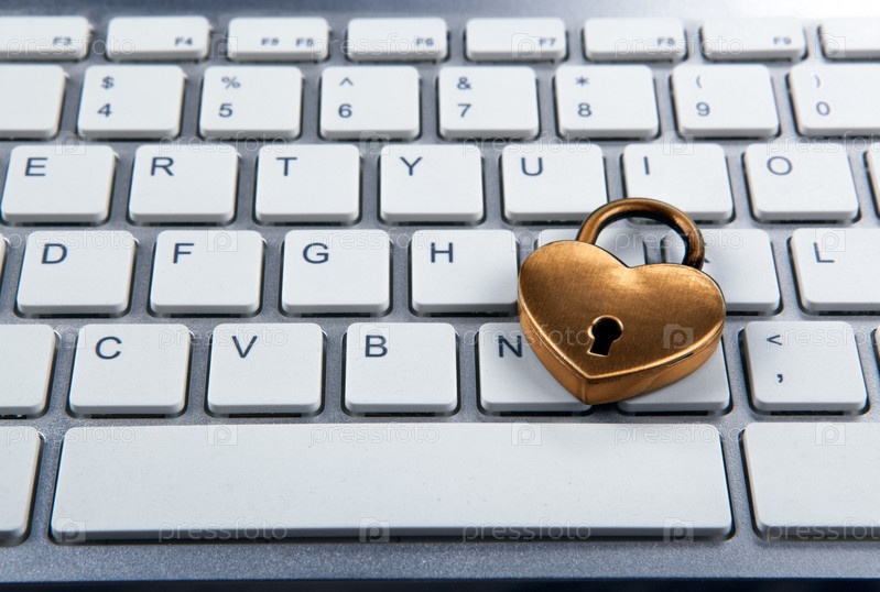 Маленький золотой замок на клавиатуре компьютера крупным планом