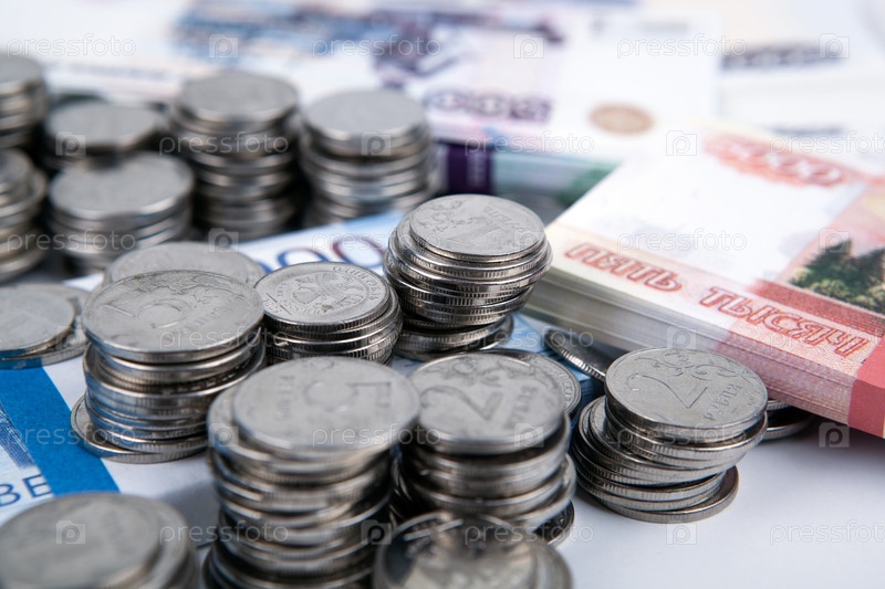 Пачка российских банкнот и много русских монет