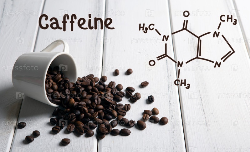 Жареные кофейные зерна в чашке с формулой кофеина на белом деревянном фоне