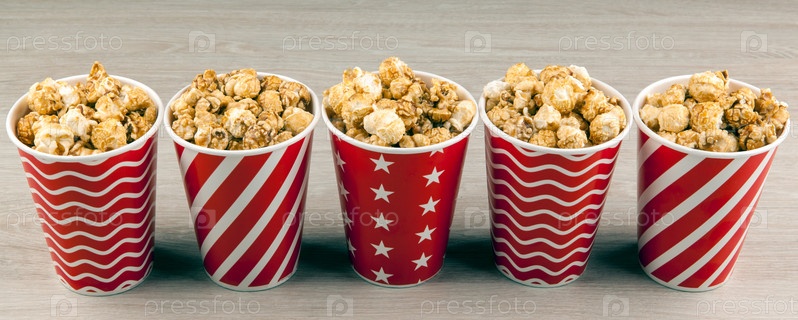Пять красных картонных стаканчиков подряд с сахарным попкорном на деревянном столе