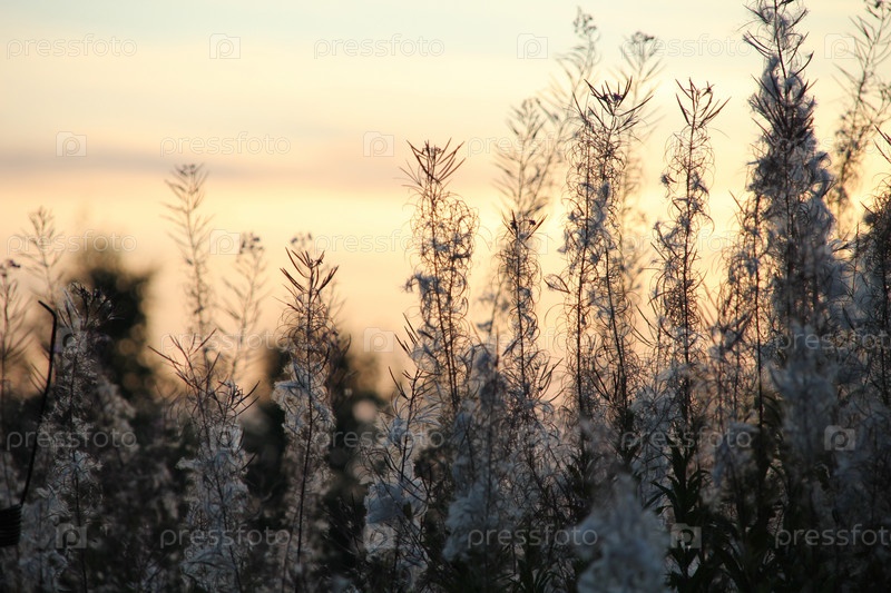 Пейзаж озера после захода солнца в листве отцветшего иван-чая