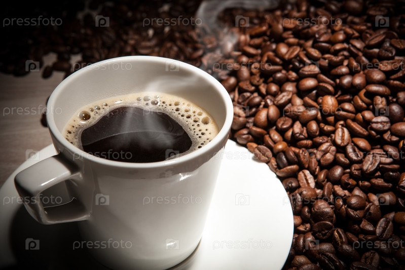 Белая чашка кофе с паром на фоне жареных кофейных зерен