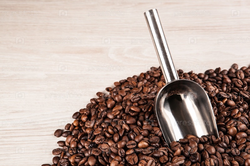 Жареные кофейные зерна с совком на деревянном фоне