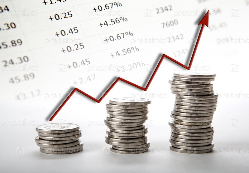 Три стопки монет с красной диаграммой прогресса