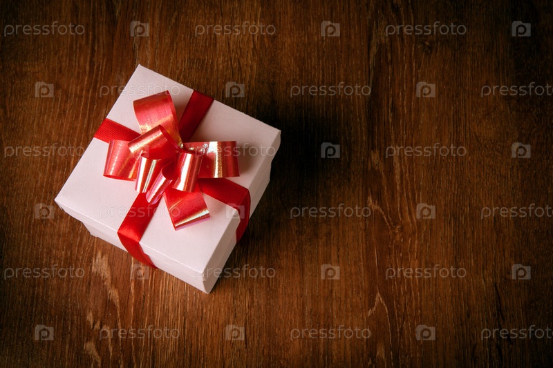 Одна белая праздничная подарочная коробка с красным бантом на деревянном столе
