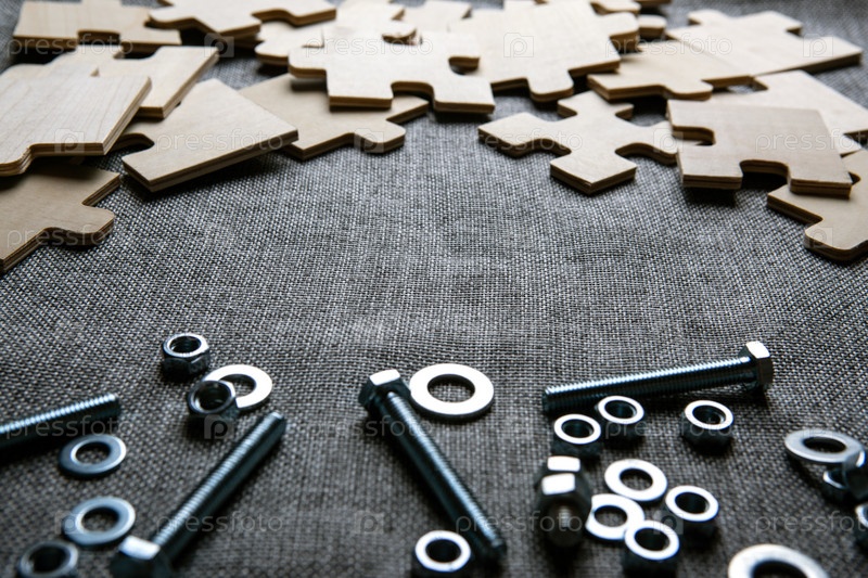 Элементы головоломки и стальные гайки, болты на текстильном фоне