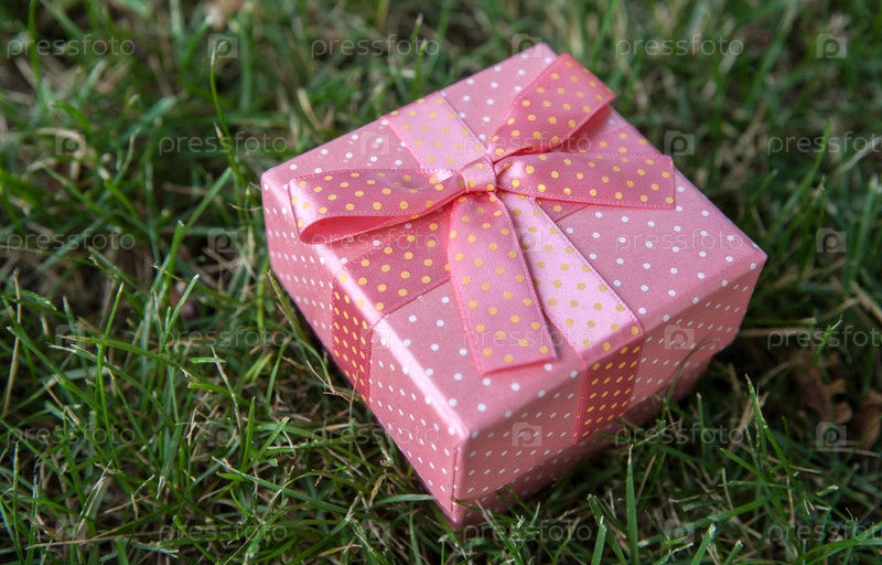 Розовая подарочная коробка с бантом на зеленой лужайке