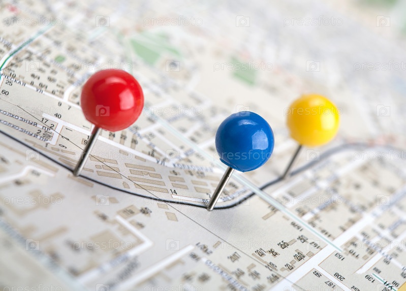 Топографическая карта с цветными иголками крупным планом