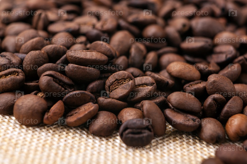 Теплые жареные кофейные зерна на мешковине крупным планом